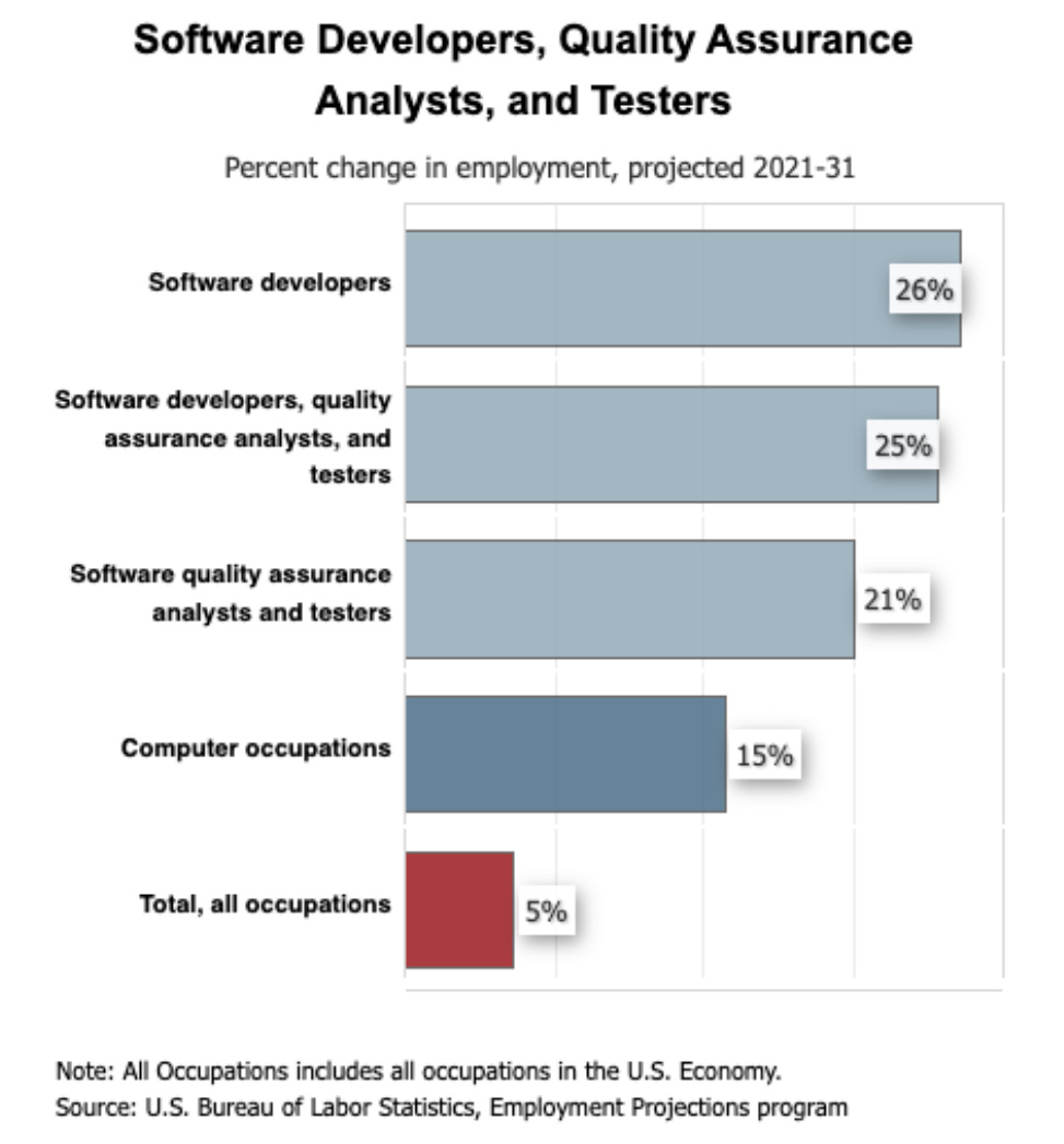 The U.S. Bureau of Labor Statistics (BLS) forecasts a 25% surge in employment for software developers in the next 10 years, far outpacing the average across all occupations.